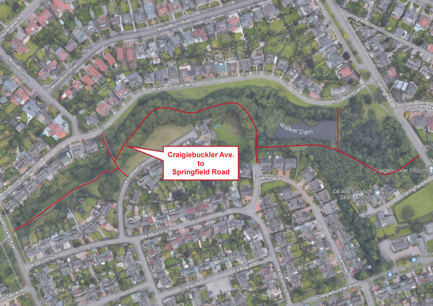 It is divided into two sections by Craigiebuckler Drive. For convenience, we shall refer to them as the West and East sections. They are almost of equal length but are otherwise geometrically dissimilar. The West section is narrow and of a more regular profile. It is approximately thirty meters wide at its broadest area. In contrast, the East section’s broadest area is forty-five meters wide, and its profile is irregular.